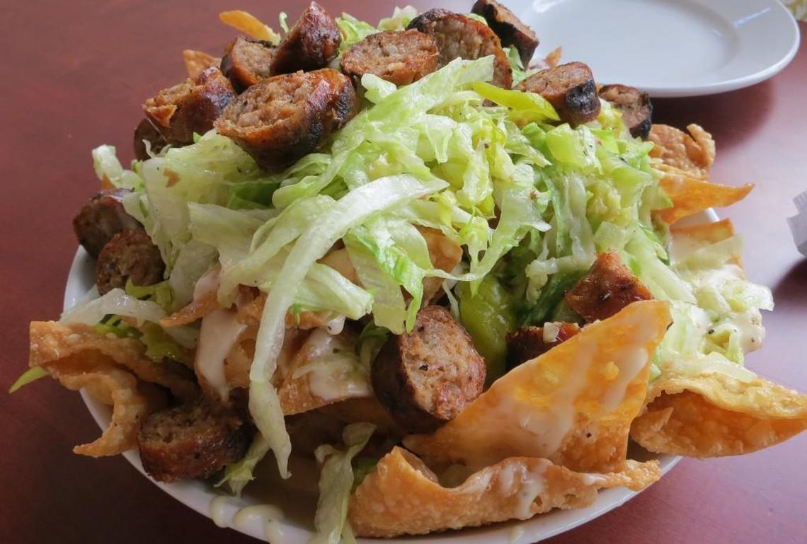 This decadent appetizer features fried pasta chips piled high and drenched with an unbelievable homemade cheese sauce that’s rich, thick, creamy and addictive. On top is a mixture of shredded lettuce, sliced pepperoncini and tomatoes tossed in a tangy dressing called “Mediterranean tomato relish.” For $3 extra you can top the nachos with chicken or sliced Italian sausage. Go with the sausage. $7, 4811 E. Central, 316-260-9667