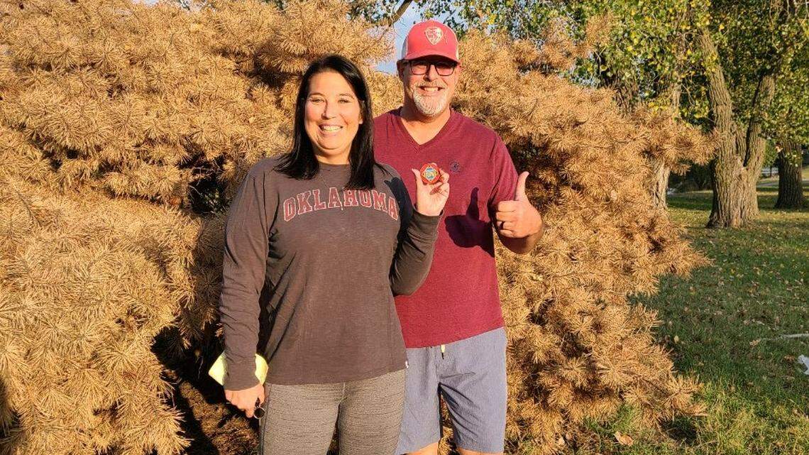 The Langworthys located the medallion just after 6 p.m. at the Big Arkansas River Park in a pile of pine needles beneath a tree. The clue that tipped them off was “big diversion” in Day 5.
