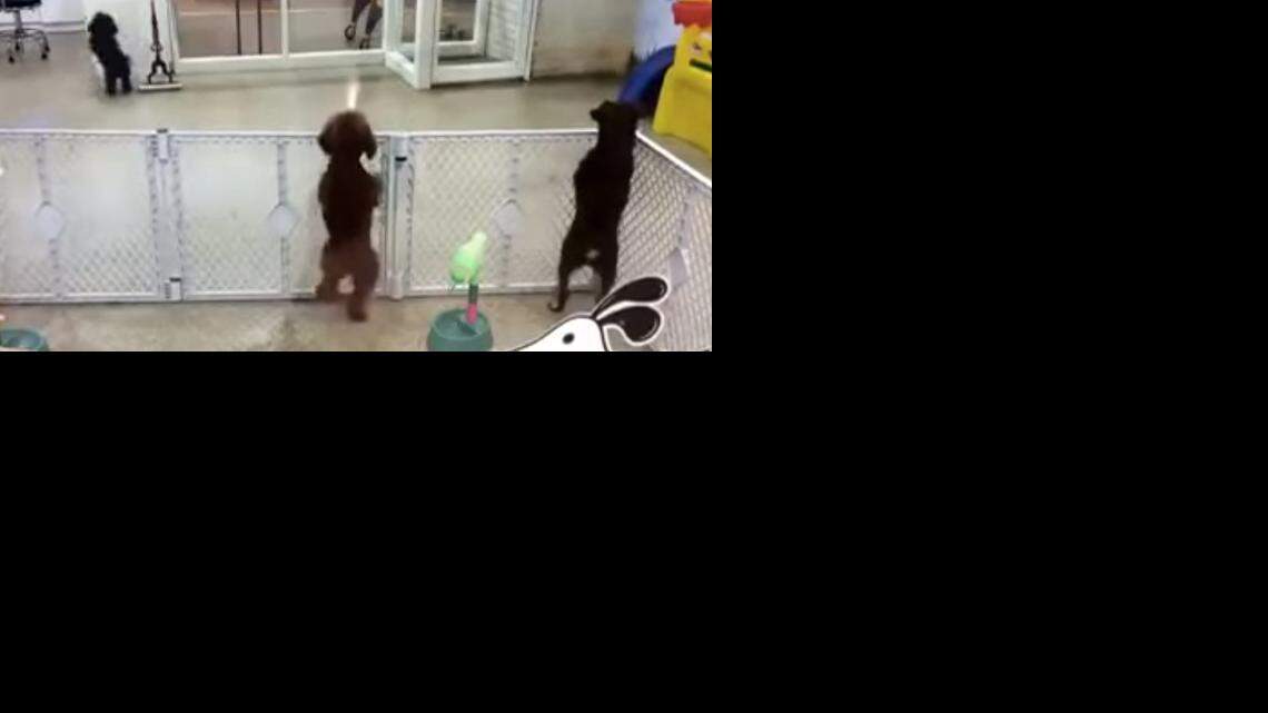 The little pup was caught on video at a doggy daycare at the very moment he spots his owner arriving to take him home.