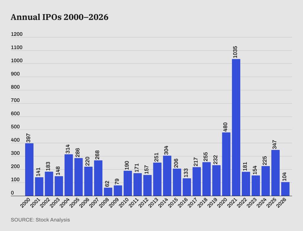 Through the first quarter of 2026, 104 companies went public, putting this year on pace for the most IPOs since 2021’s record high.
