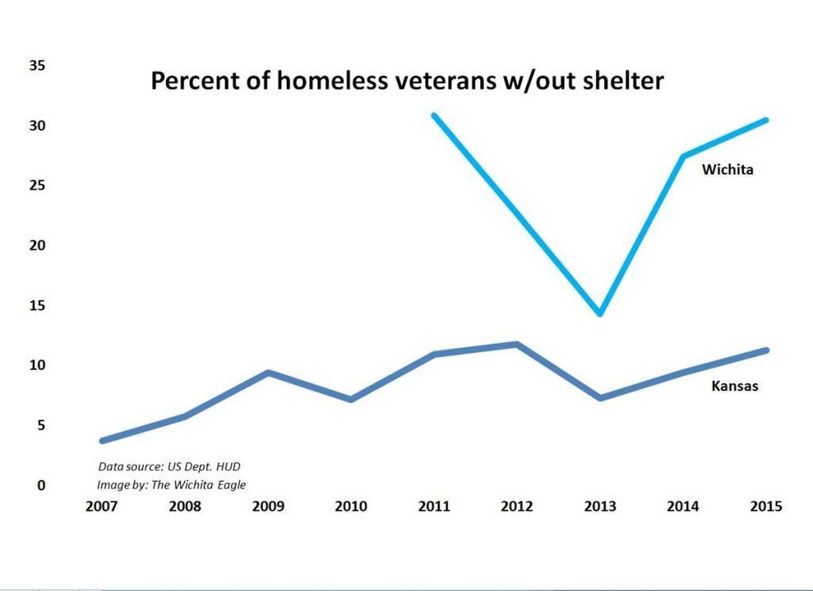 The percentage of homeless veterans in Kansas who don’t have a place to sleep has been rising slowly. In 2007, only 4 percent lacked shelter, but that has risen to 11 percent.