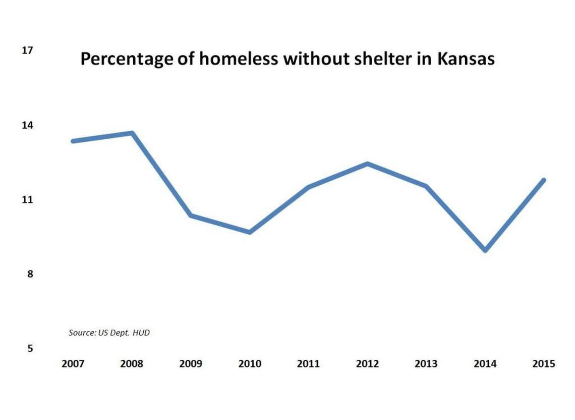 The state hasn’t had the same problems recently with finding shelter for its homeless. The percentage of homeless people in Kansas without shelter has actually been falling a little since 2007.