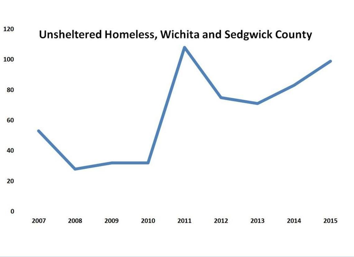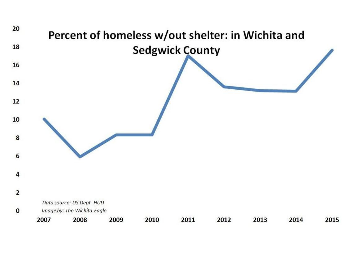 The number and percentage of homeless in Sedgwick County without shelter has roughly doubled over the past eight years. About 100 homeless people, or 17 percent, lack shelter here.