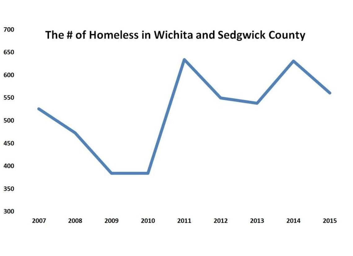 Although there was a small dip in the homeless population in Sedgwick County this year, from 631 to 561, it remains at near the highest level it’s been since the recession of 2008. It’s the third-highest total since 2007.