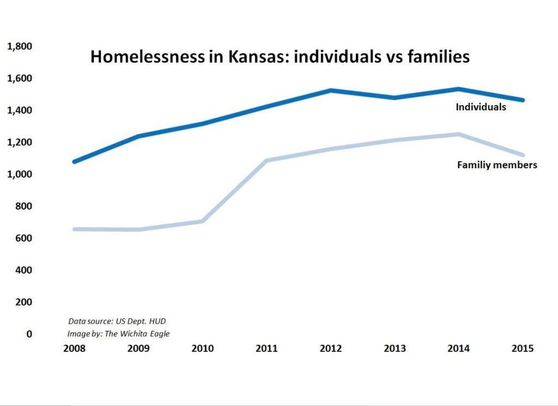 The increase in homeless people without shelter is almost entirely single individuals, not families. The 150 homeless family members, which make up about a quarter of the homeless in Wichita, all have shelter, according to the study.