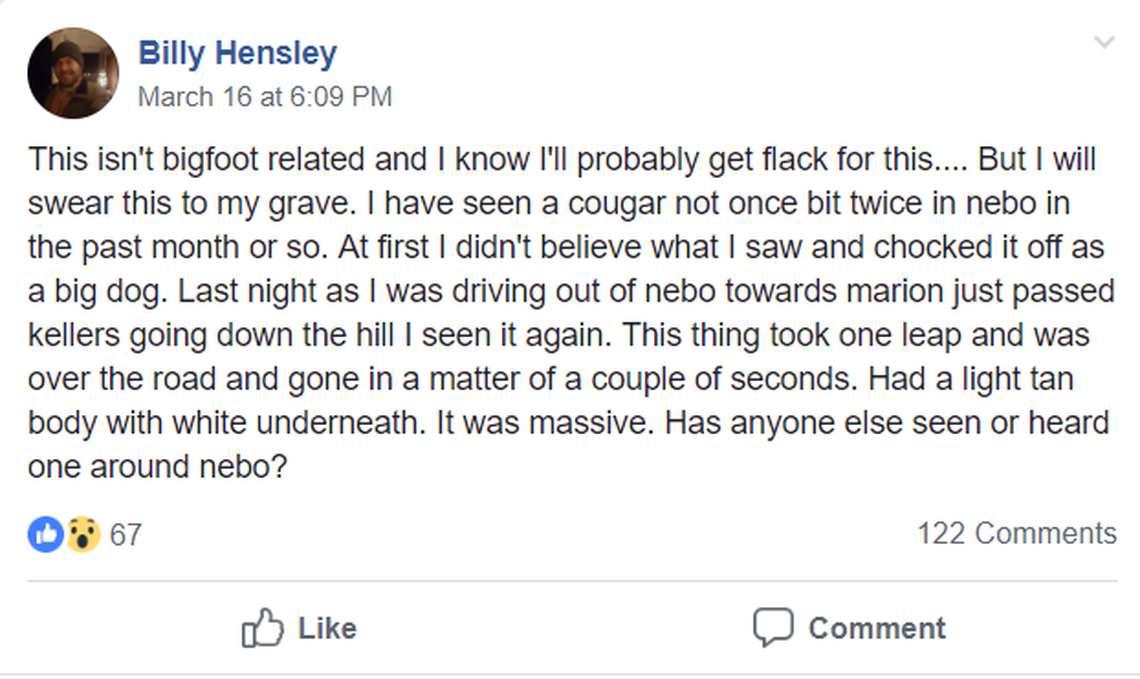 “I know I’ll catch some flack for this,” posted Billy Hensley on Saturday. “But I will swear this to my grave: I have seen a cougar not once but twice in Nebo in the past month or so.”
