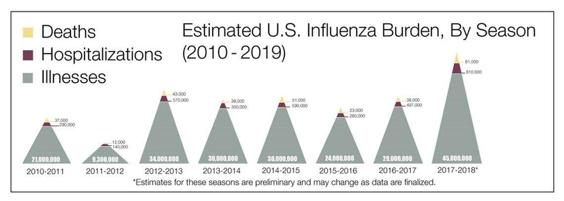The Centers for Disease Control and Prevention estimates that the flu, also known as influenza, has resulted in between 12,000 and 61,000 deaths in the U.S. each year since 2010.