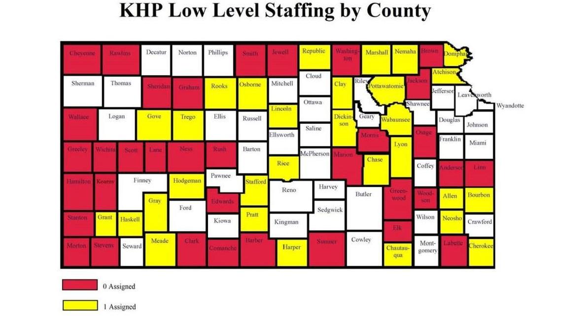 More than a third of the counties in the state have no Kansas Highway Patrol officer serving them, according to data from the law enforcement agency.