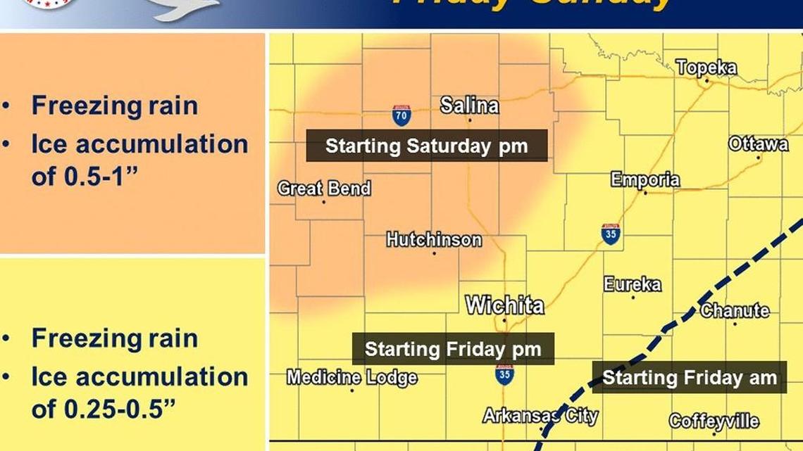 The National Weather Service has issued an ice storm warning for 6 p.m. Friday until noon Sunday for 10 counties in south-central Kansas, including the Wichita metropolitan area.