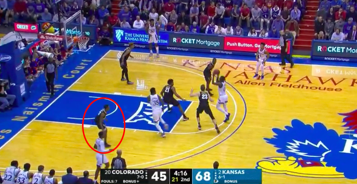 This time, Schwartz “tags” Azubuike to stop his progress. Dotson’s pass then goes to Agbaji, who has enough space to hit the semi-guarded three with Schwartz late to recover.