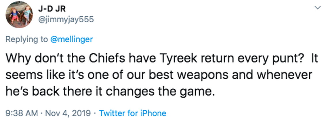 The point I’m making here is that the risk-reward balance on having Hill return punts must account for his importance to the offense.