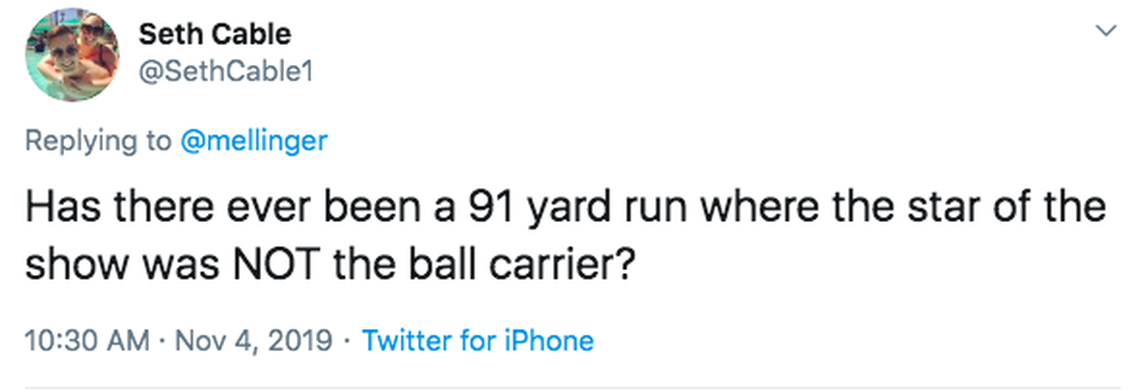 At the time, I said it looked like Damien Williams was running and then Tyreek Hill was on one of those airport people movers. I saw someone else compare it to Mr. Freeze.