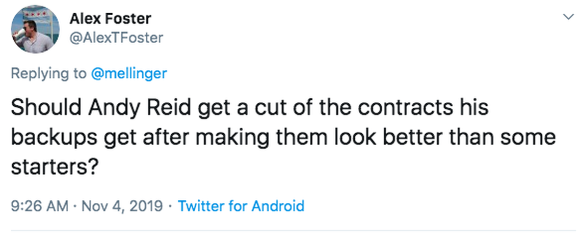 Yes, I’m aware that he missed most of the Jaguars game and all of the next four and the Chiefs were still (mostly) effective on offense.