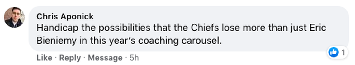 Assuming Eric Bieniemy is hired, there’s always the chance that he’d take some guys with him. But the Reid assistants who’ve been hired as head coaches don’t typically do that. Reid could also block, say, Mike Kafka from leaving to be an offensive coordinator somewhere by giving him that title here.