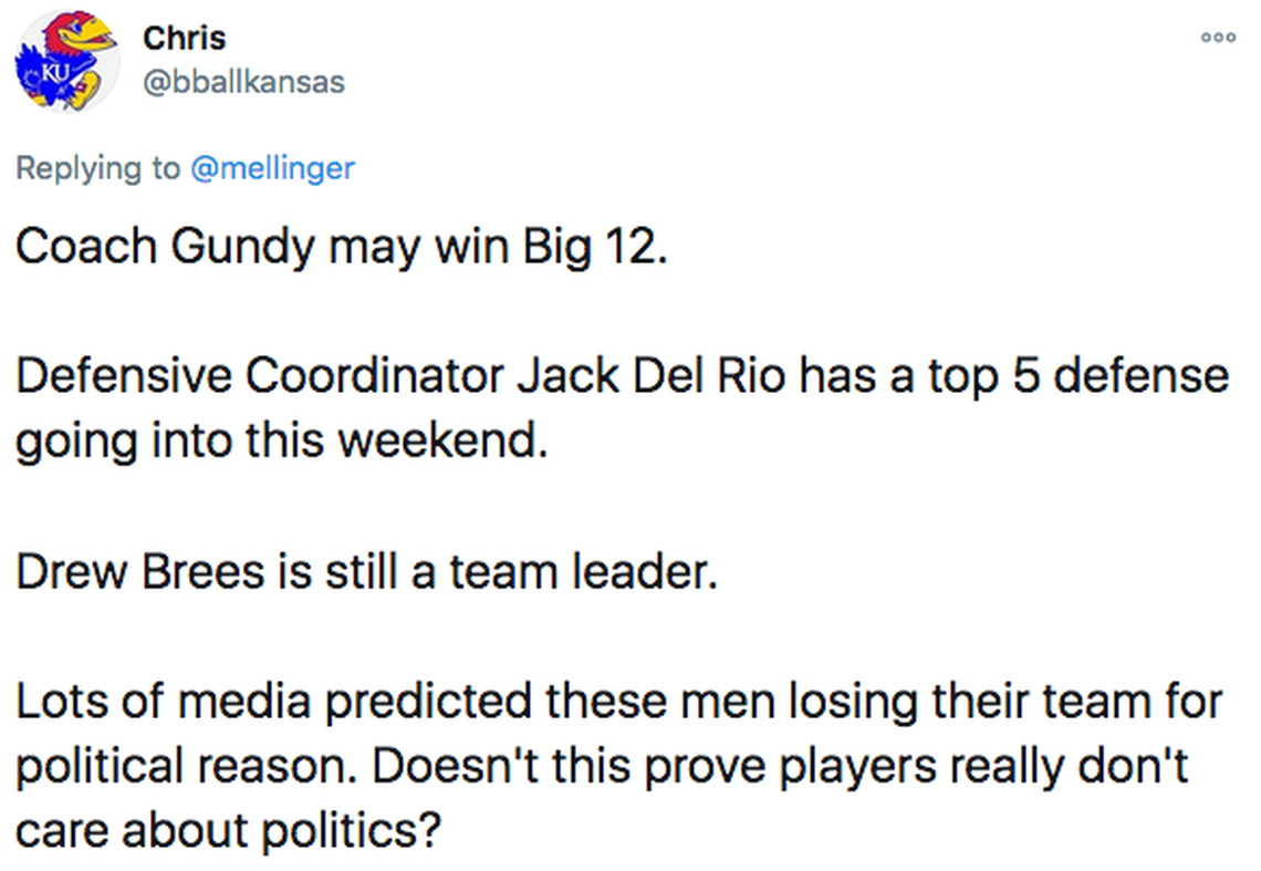 It’s also worth noting here that Gundy and Brees each had lots of conversations after saying (or wearing) things that created some tension. I’m less familiar with Del Rio’s body of work, but those conversations are how progress is made.